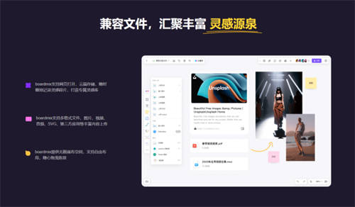 boardmix素材库是一款基于云端的在线素材管理软件,支持采集网页图片、文本、链接等元素,同时可上传本地的各类文件,包括TXT、PDF、Word、WPS、视频、音频等,在一处集中管理所有内容,且boardmix内置了多种可视化工具(如便签、思维导图、PPT、画笔、看板等)和AI助手,轻松组织和呈现各种灵感碎片,全面提升办公用户的生产力。
