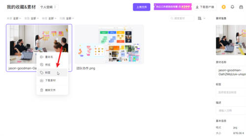另外,右击素材库的图片,点击浮窗的「标签」选项,也能给图片快速添加标签。