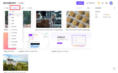 boardmix素材库支持上传多种文件类型,不局限于图片,但如果我们只想查看保存到素材库中的图片,可以点击素材库左上角「类型」右侧的下拉箭头,在弹出的浮窗,勾选「图片」,就能筛选出素材库中的所有图片。