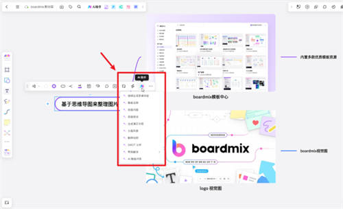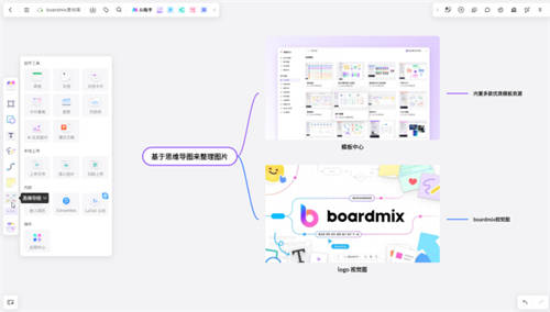 将素材库的图片或文本插入boardmix画布后,我们可以使用内置的可视化工具来组织和呈现这些内容,譬如点击boardmix左侧工具栏的「思维导图」,在画布上插入思维导图,基于思维导图来整理图片,让相关的内容关联整合到一起。