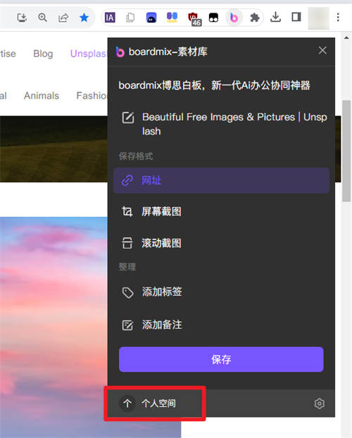 单击剪藏插件图标,会弹出下图所示的面板,「保存格式」可选择剪藏当前的网址、屏幕截图、滚动截图(即长截图),面板左下角可设置保存的位置,分为个人空间或团队空间。