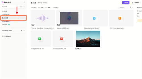 除了通过浏览器插件剪藏内容,boardmix素材库还支持导入电脑本地的多种文件,包含图片、视频、音频、Word、Excel、PDF等。点击boardmix素材库右上角的「上传文件」按钮,即可将文件快速导入素材库中。