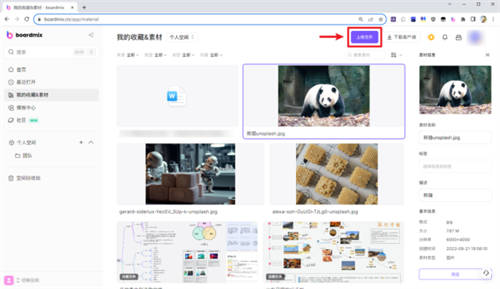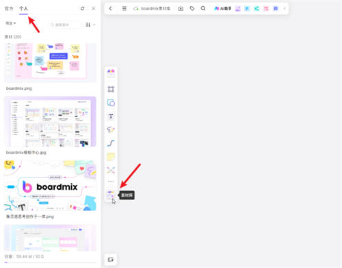 在打开的boardmix文件中,点击左侧工具栏底部的「素材库」,左侧会打开一个面板,点击左上角的「个人」选项卡,同样可以看到我们采集保存到boardmix素材库的所有内容。单击任意一个内容,可将其直接插入右侧的boardmix画布。