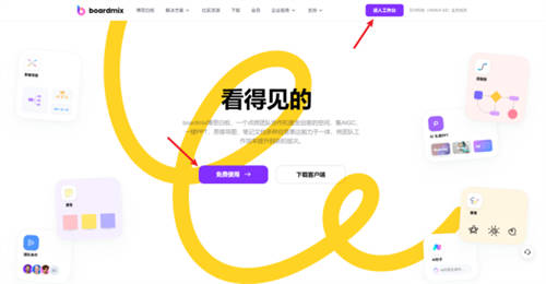 在浏览器打开boardmix博思白板的首页,点击中间的「免费使用」按钮,进入boardmix的工作台页面。