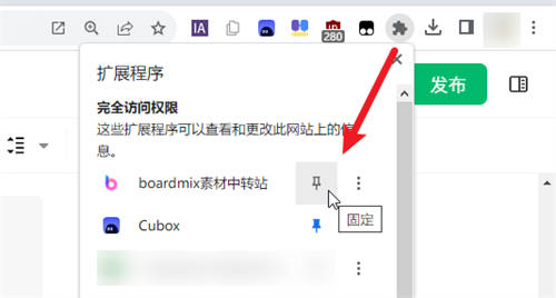 安装boardmix素材库插件之后,点击浏览器右上角的「插件」图标,将boardmix插件固定在浏览器的右上角方便使用。