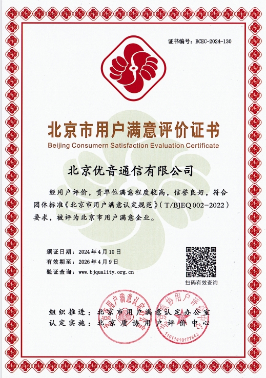 2024年4月11日,北京社会企业质量协会发布了2024年第一批“北京市用户满意企业”名单,优音通信成功入选并获得“北京市用户满意企业”称号。