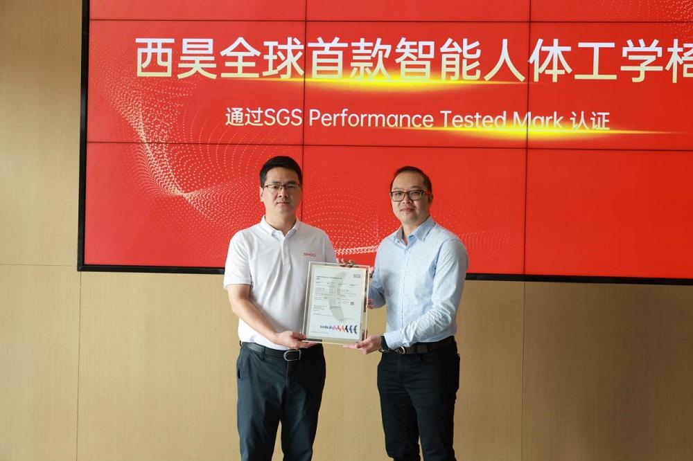 近日 , 西昊全球首款智能人体工学椅 SGS Performance Tested Mark 认证颁证仪式隆重举行。作为全球首款智能人体工学椅 , 西昊智能人体工学椅 T6 通过了《GB4706.1-2005 家用和类似用途电器的安全》和《ANSI BIFMA X5.1-2017 ( R2022 ) 》两项标准 , 获得了全球最大的第三方权威检测认证机构 SGS 颁发的 SGS Performance Tested Mark 认证。这是中国人体工学椅行业首张由 SGS 颁发的认证证书 , 标志着西昊在智能人体工学椅领域取得了重大突破。西昊智能家具总经理刘帅、轻工产品服务华南区经理陈嘉男、轻工产品服务实验室经理陈冠宇、华南区家电实验室经理蒋中文等多位 SGS 领导出席了此次颁证仪式。