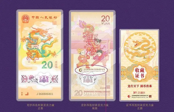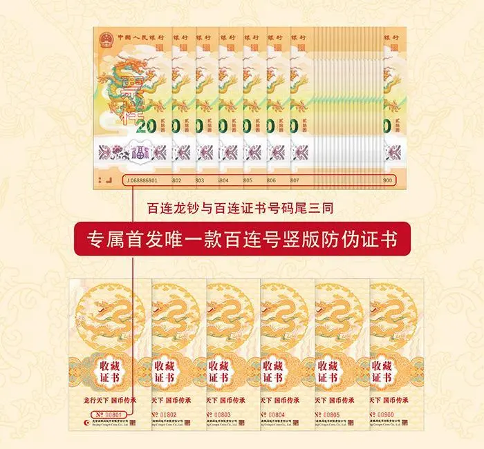 据悉,该《龙行天下 国币传承》—2024年贺岁纪念钞系列装帧产品内含100张2024年贺岁纪念龙钞(百连号)及专属首发的唯一款百连号竖版防伪证书(百连龙钞与百连证书号码尾三同)。