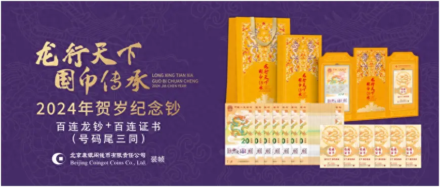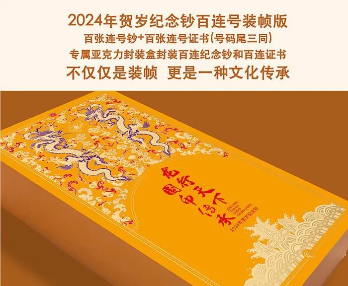为最大限度的满足社会各界的多样化需求,秉承“国币装帧,必出精品”的服务理念,北京康银阁钱币有限责任公司推出了《龙行天下 国币传承》百连号贺岁纪念钞装帧产品,全国限量装帧999套。该产品也是2024年贺岁纪念钞系列产品的收官之作。