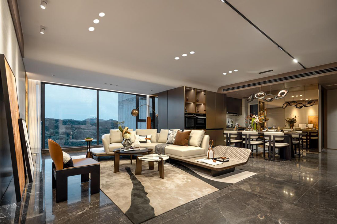 开阔的客厅以颠覆空间尺度界限的布局,让城市与自然成为家的归属,在令人沉醉的湖光水色中,演绎意式典雅雕琢的生活美学。超大开间大横厅,目光所及皆是波光粼粼的绿色,家如同荡漾在湖面的船只,晃悠悠地摇曳着、让人心驰神往。