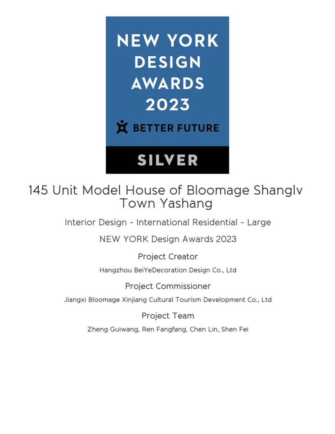 Asian Design Awards 亚洲设计奖是面向全球设计师的国际设计大奖,由BETTER FUTURE主办,旨在表彰具有无限创意的设计作品。华熙·雅尚145平样板间项目荣获类别银奖。
