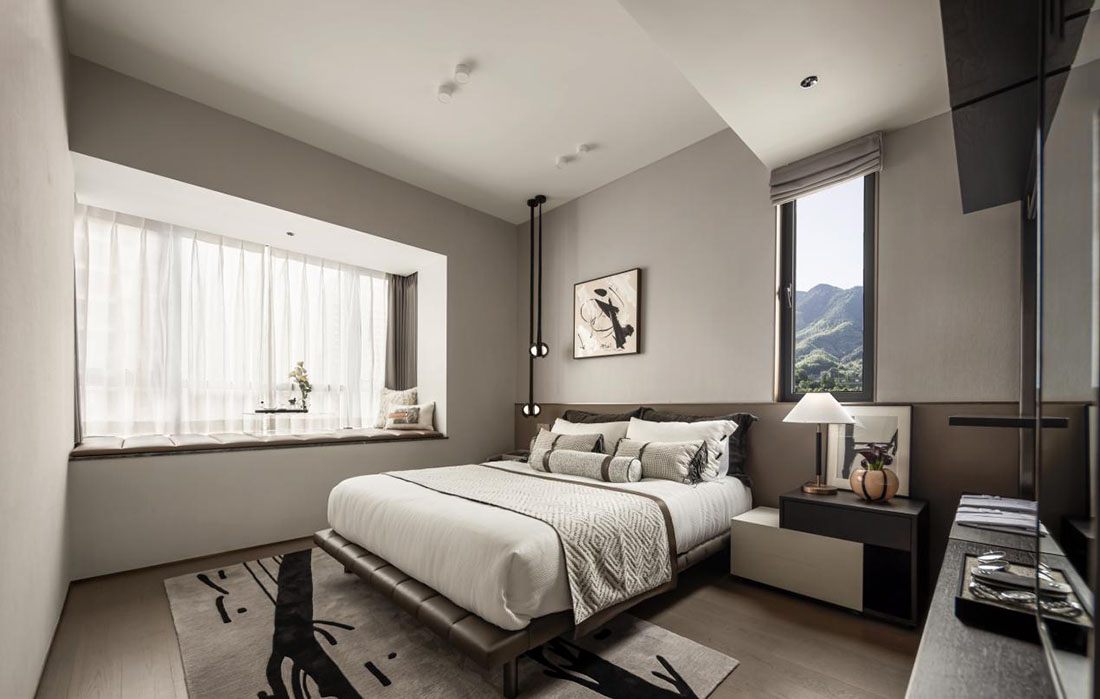 主卧浅灰底色更显温馨,配备独立卫浴、超大飘窗,私享小家化的体验打造现代人居新范本,以适配塔尖人士的尊崇身份。床头软包采用竖条格栅软包,搭配木饰面背景墙、金属线装饰,线条简约,让空间更具层次感。通过不同材料的有机结合,兼顾视觉感受和物理功能。