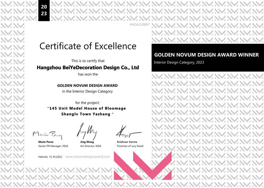 Novum设计奖作为国际顶端的设计赛事, 是设计作品质量的证明,致力于表彰设计领域的优秀设计师及作品。主要设置了建筑设计、室内设计、城市规划与景观设计、家具设计、照明设计、数码艺术与平面设计、包装设计、珠宝设计、时装与纺织设计、以及摄影与照片处理设计十大参赛类别,每个类别颁发金、银、铜等各类大奖。华熙·雅尚145平样板间项目荣获类别金奖。