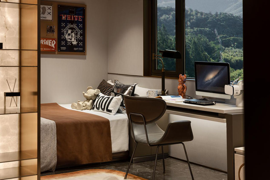 儿童房采用开放化设计,节约空间加强亲子互动的功能性,连贯直线体现空间流畅性,简约暖调配色,干净的底色使得视线重心得以聚焦到那些造型生动、色彩活泼的手办上。色彩明亮地毯与童趣造型的凳子是自由与天真的投影,这是儿童房的专属调性。