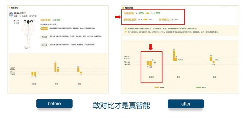 一个真实案例,体现智能美养的强大之处。顾客肖小姐出现感冒症状,经过奈瑞儿的AI检测后,根据检测结果选择对症调理方案,并使用温养仪针对昆仑穴与神阙穴进行温灸20分钟,调理后体能指数从5.9上升至13.3,膀胱经虚弱程度-15.4上升至-0.5,好转度为96.75%。