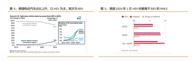 总体而言,在交通领域低碳转型的大趋势和实用层面,欧美消费者更加青睐HEV。响应下游需求的变化,在生产端,欧美汽车制造商也放缓了纯电车的生产节奏,将更多注意力转向HEV和PHEV。如福特汽车首席执行官Jim Farley就计划将HEV的产量提高四倍。日系车三巨头丰田、本田、日产一直以来都是HEV的忠实拥趸,电动化转型均以HEV为主。