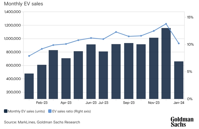 按照悲观情况,高盛预测,2024年全球范围内纯电车销量将同比下降2%。而混合动力汽车销量则可能会超出预期100-200万辆。