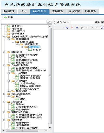 五、业务功能 北京非凡影界文化传媒股份有限公司通过软件平台的功能 模板表单设计 /权限控制 /工作流 /表间公式/条码的设置完成了设备的库存盘点入库、出库 通过条码枪扫码自动扫码 提供工作效率。入库单的条码扫描