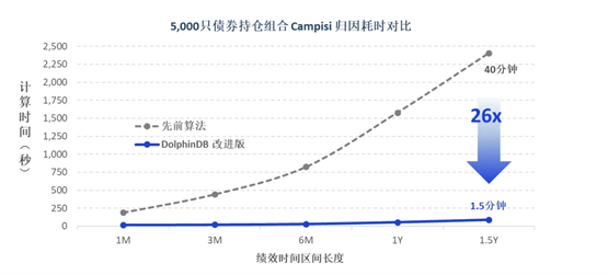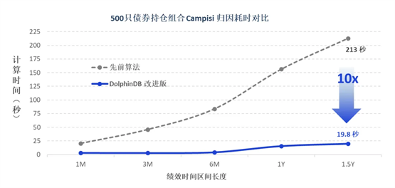 以对 500 只债券组合的持仓数据进行 Campisi 归因计算为例,耗时由分钟级降低至秒级。当绩效时间区间达到 1.5 年时,采用 DolphinDB 后的归因耗时仅为原技术方案的1/10.