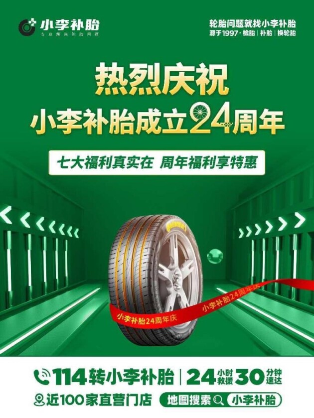 小李补胎24周年庆盛大启幕!持续时间6月6日至6月30日,活动期间到小李补胎郑州、洛阳区域近100家门店均可尊享多项优惠与感恩回馈。