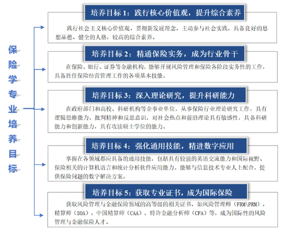 保险学专业人才培养坚持以习近平新时代中国特色社会主义思想为指导,秉持“育人为本、德育为先”的教育观,通过与高等院校的专家的充分研讨,与德华安顾、中国人寿等保险行业的领军企业的深入对话和交流,收集和分析毕业生的反馈,立足行业需求,注重数字创新,突出“重交叉、厚基础、偏应用”特色,形成了“数字+保险+服务”三位一体的保险学专业人才培养方案设计理念,致力于建设成为“国内一流,国际具有一定影响”的保险学本科专业。