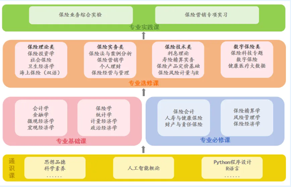 以保险行业为抓手,强化行业、学科、专业交叉融合,在人工智能概论、Python语言编程等公共基础课程基础上,开设《健康医疗大数据》《保险科技专题》《数字保险》等特色交叉课程,进行数字化创新与赋能。