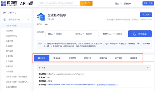 开发者对于接口调用的便捷性和效率有着很高的要求,因此,在新版平台中,商商查API市场重点针对详情页进行了优化升级。每个API接口的详情页都增加了详细的使用说明和调用示例,清晰展示了接口的基本信息、请求参数、返回结果、示例代码、错误代码等内容。这些说明不仅能够帮助开发者快速理解接口的使用方法,还能在实际调用过程中提供有效的参考和指导。