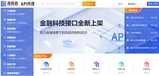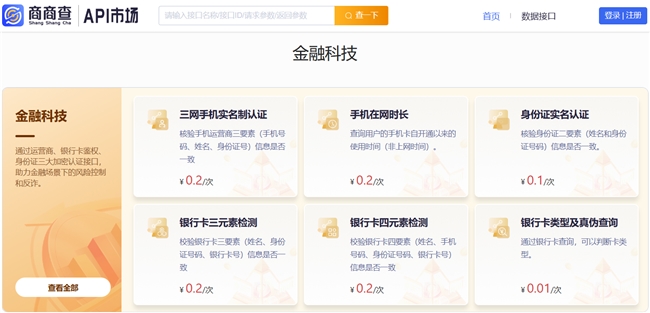 除了企业类的API接口,为助力金融场景下的风险防控,方便开发者完成一站式的接口调用,商商查还上线金融科技类接口(运营商、银行卡鉴权、身份证三大加密认证接口),接口主要包括三网手机实名认证、身份证实名认证、银行卡三元素检测等常用形式。商商查已针对这些金融类接口进行了严格的安全测试和风险控制,确保数据的安全性和可靠性。