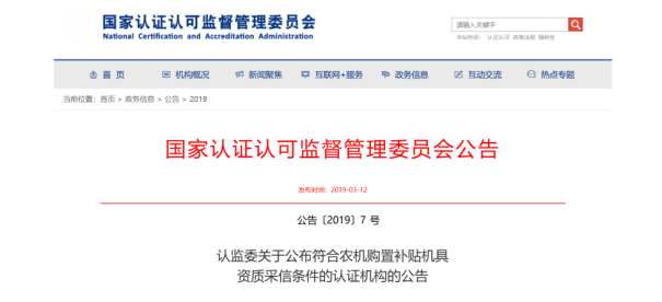 不仅如此,赛姆认证还以丰富的认证经验及专业的经营能力,成功通过了国家认监委的重重筛选与评估,成为国内仅有的两家符合农机购置补贴机具资质采信的认证机构之一。