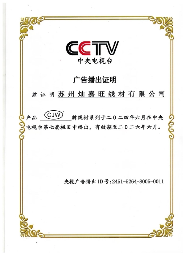 CCTV作为我国高权威、高公信、高覆盖、高影响的国家级电视媒体,其影响力触达全国将近14亿人口,是国内含金量相当高的传播平台,一直以来在消费者心目中有着很强的影响力和公信力。经过多次调查审核,凭借出色品质和实力,苏州灿嘉旺线材有限公司不负众望,以良好的企业形象、卓越的产品品质、过硬的产品口碑顺利通过层层审核,才允许被播出,荣幸登录CCTV-7频道进行品牌展播。一方面充分体现了苏州灿嘉旺线材有限公司雄厚的实力与底气,另一方面也体现了其对自身产品的充分自信以及对未来前景发展有着十足信心。