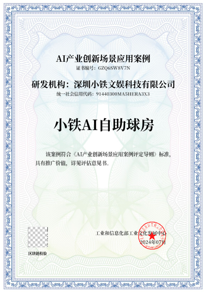 日前,深圳小铁文娱科技有限公司的小铁AI自助球房,经过工业和信息化部工业文化发展中心数字科技中心的严格评估,荣获“AI产业创新场景应用案例”认证。
