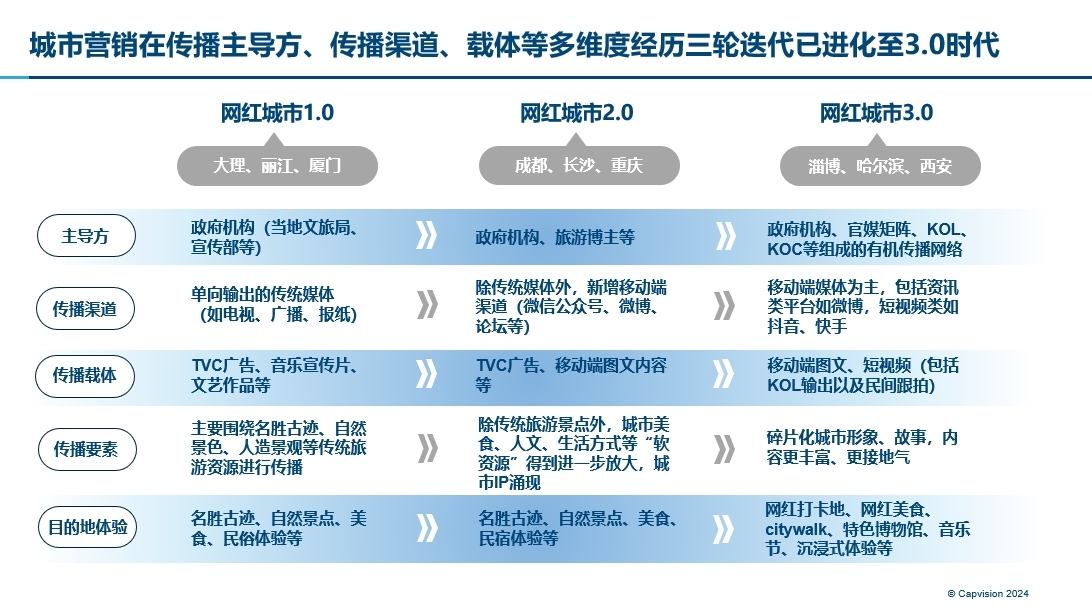 1.0、2.0、以及3.0时代的网红城市营销在话语权主导方、传播渠道、载体以及传播内容等层面总结盘点如下: