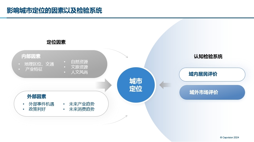 定位主要考量的因素包括内部因素和外部因素,内部因素包括城市的地理区位、产业特征、自然资源、文旅资源、人文环境等,而外部因素则包括一些重大的事件机遇、政策利好以及未来产业和消费趋势。