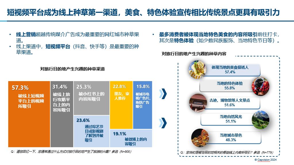 57.3%的被访者会因为被线上短视频所吸引而对某座城市产生旅行兴趣,超过传统OTA平台以及传统媒体渠道如电视广告、地铁广告等成为第一种草渠道。