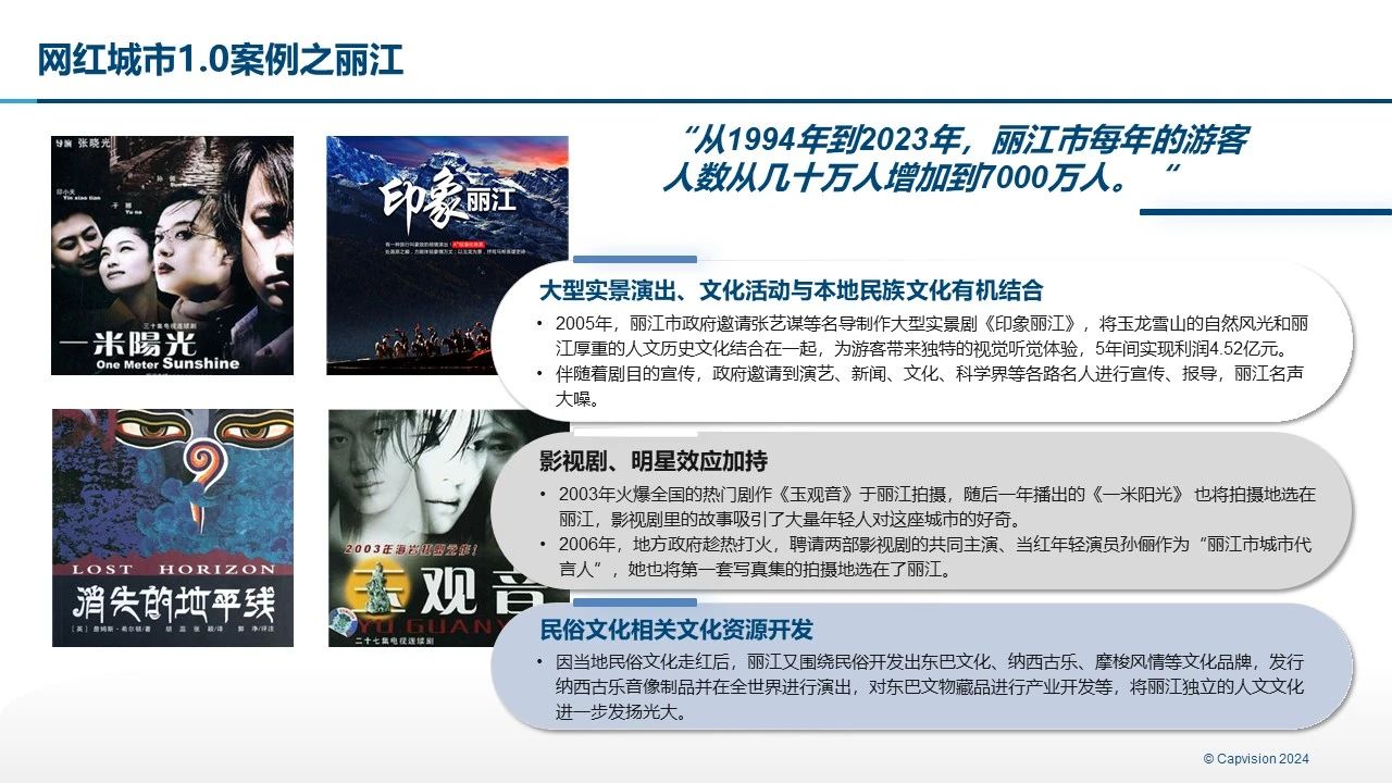 这一阶段国内的城市营销尚未形成成熟且系统的运作模式,但仍诞生了一些经典案例,如丽江、大理、厦门等城市。地方政府在CCTV大量投放城市宣传片、MTV等,邀请知名导演编排大型实景演出,同时在一些风靡全国的影视剧文艺作品的加持下,初代网红旅游城市就这样被推到了民众面前。
