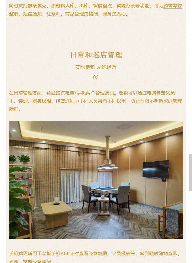 ÔÚÈÕ³£¹ÜÀí·½Ãæ£¬Üø½³ÌṩµçÄÔ/ÊÖ»úÁ½¸ö¹ÜÀí¶Ë¿Ú¡£Àϰå¿ÉÒÔͨ¹ýµçÄÔ×Ô¶¨ÒåÔ±¹¤¡¢¾Àí¡¢²ÆÎñȨÏÞ£¬¾Óª¹ý³ÌÖв»Í¬ÈËÔ±¾ßÓв»Í¬È¨ÏÞ£¬·ÀֹȨÏÞ²»Ã÷Ôì³ÉµÄ¹ÜÀí©¶´¡£ÊÖ»ú¶Ë¸üÊÊÓÃÓÚÀϰåÊÖ»úAPPʵʱ²é¿´¾ÓªÊý¾Ý£¬»áÔ±±¨±íµÈ£¬×öµ½ËæÊ±ËæµØ²éÕË¡¢¶ÔÕË£¬ÕÆÎÕ¾ÓªÇé¿ö¡£