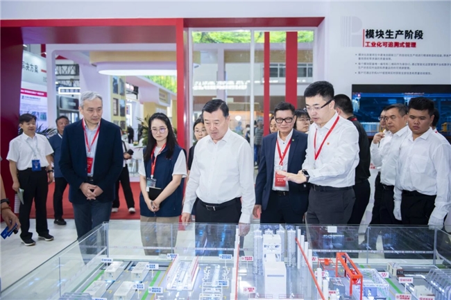 在中建海龙科技展区相关领导深入了解像造汽车一样造房子、像汽车4S店一样提供全生命周期一站式“好房子”服务等内容,并实地参观桦皮厂胡同8号楼样板间,对中建海龙科技的创新实践表示肯定。
