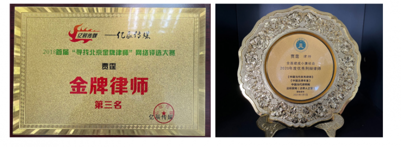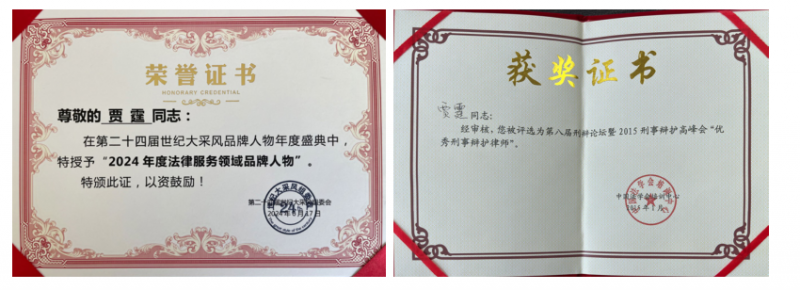 在法律这条道路上,贾霆获得了无数的称赞和荣誉。例如,他的案例文章《三百多万拆迁款应当归谁?》在第二届中国律师原创文章大赛中获一等奖;两次被授予“优秀刑辩律师”的称号;2016年,入选光明日报社主编的《追梦中国》大型丛书,并被选为《精英律师卷》封面人物;2019年,当选北京市第十一届律师代表大会代表、北京市朝阳区第三届律师代表大会代表;2021年9月,被对外经济贸易大学法学院聘为“法律硕士研究生校外实践导师”;2024年4月,被中华名人库委员会聘为副主席;2024年6月17日,他应邀参加第二十四届世纪大采风盛典,被授予“2024年度法律服务领域品牌人物”。