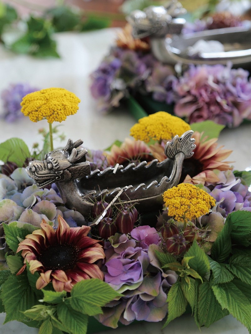 其中,空间展厅内的餐桌花采用来自野兽派的龙船元素,寓意着“龙船运福”的吉祥意义。