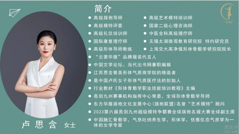 卢思含女士是一位多才多艺且富有成就的女性,她的职业生涯横跨了多个领域,从高级旗袍导师到高级模特评委,再到高级礼仪培训师和国际康复理疗师,展现了她在多个方面的深厚造诣和广泛影响力。