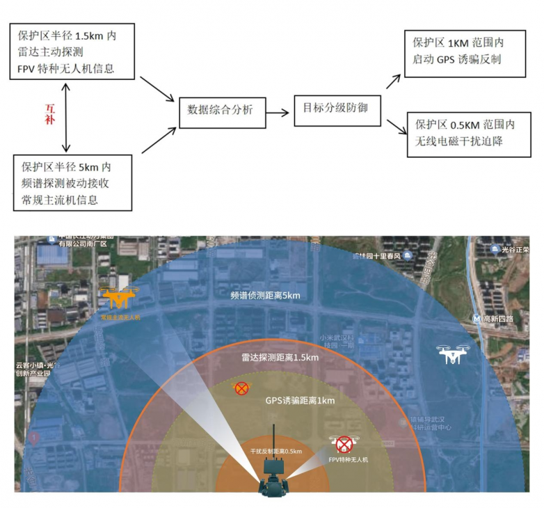 通过雷达(针对FPV特种无人机)和频谱(针对常规/主流无人机)互补联合,基本涵盖现今社会上无人机产品探测,将区域内的态势实时的返回到应用软件上,应用软件根据业务设计制定反制策略,以此驱动导航诱骗模块与干扰模块工作。