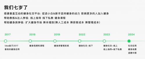 希知App诞生于2017年,经过七年的发展,我们从健身课程、健身房管理系统、再到健身社交进行了市场的探索验证,最终定位是一款以健身为场景的社交应用。通过社交的属性衔接健身各个层次的人群,通过社交的场景连接线上指导和线下私教,通过社交的粘性融合To C和To B,健身社交是健身全场景的解决方案:促进小白、新手坚持健身动力、帮助教练和达人挣钱,帮助健身房挣钱。