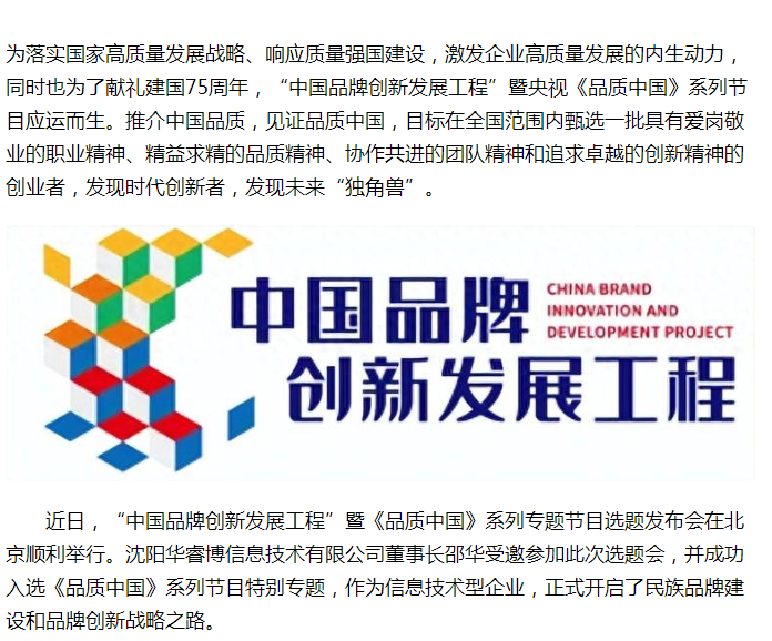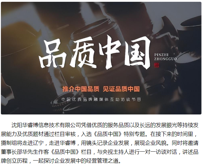 :沈阳华睿博信息技术有限公司:入选《品质中国》系列专题节目...