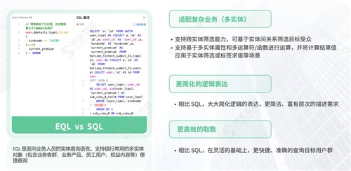 举个例子。在我们实际服务过的某险企营销场景中,该险企在筛选「购买分红险,且当期保费大于 1 万元的用户」时,使用传统的 SQL 和 EQL 在效率和质量上有着明显的区别:如果按照传统的写 SQL 作为计算表述的方式,该险企需要非常繁琐的代码来做取数和计算,而换成了 EQL 之后,代码量大大降低,不仅写起来简单,调试维护也非常方便。