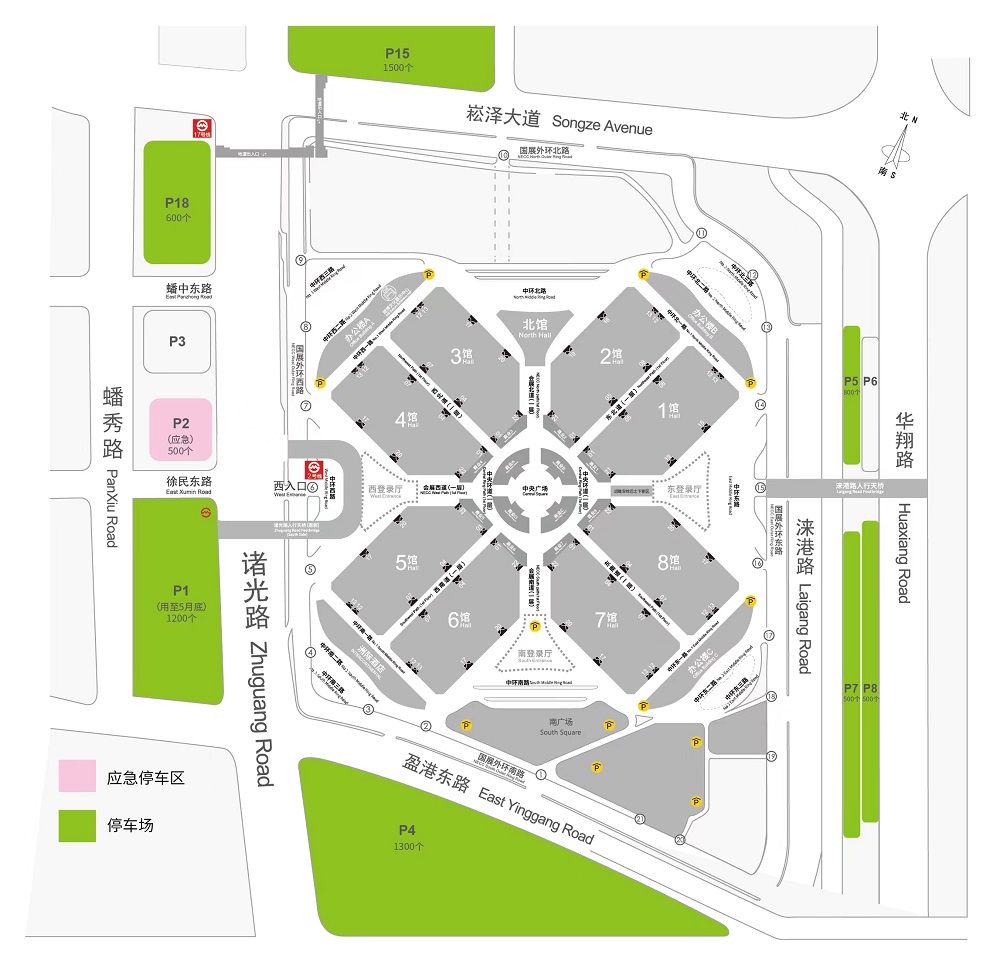 观众自驾出行可定位至“国家会展中心10号门(近NH北广场社会车辆停车场)”或虹桥世界中心停车场或中国国际进口博览会(进博会)停车场P2、P3、P4、P5、P7、P15、P18