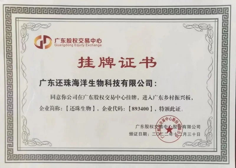 金融活则产业兴,产业强则金融强,还珠海洋深谙此道理。在湛江市农业农村局和广东省农业农村厅的协助和推动下,还珠海洋2023年5月16日在广东股权交易中心成功挂牌展示,股权代码:893400。标志着还珠海洋开启了以金融为翼,驱动湛江珍珠与生蚝产业腾飞的新篇章,打响湛江珍珠与生蚝品牌!