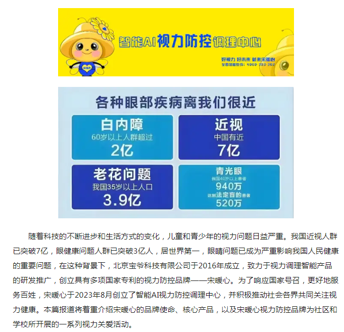 :随着科技的不断进步和生活方式的变化,儿童和青少年的视力问题日益严重。我国近视人群已突破7亿,眼健康问题人群已突破3亿人,居世界第一,眼睛问题已成为严重影响我国人民...
