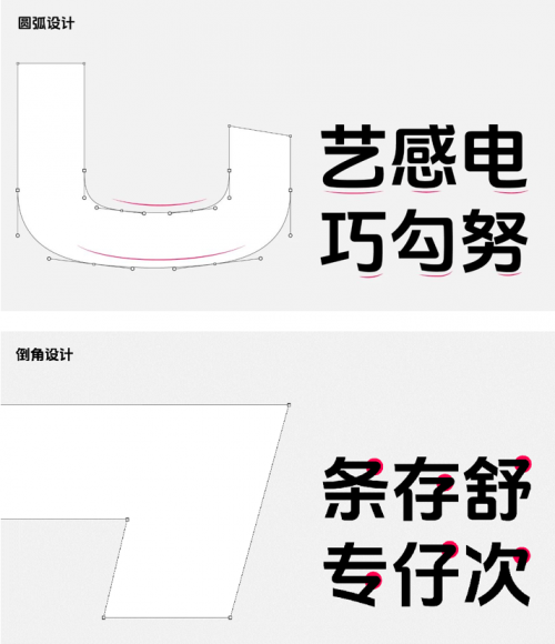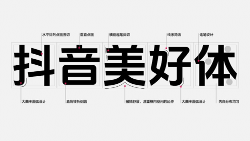 为构建品牌字体的独特性,抖音美好体的笔画细节采用了非常规的圆弧设计和倒角设计,弯钩笔画采用大曲率圆弧曲线,均匀顺滑的线条设计使得字体更流畅优美,更具视觉韧性。折笔笔画则在平衡字体易读性和识别度的基础上,采用了内直外弧的倒角方式,传递出一种“刚柔并济”的人文气息。