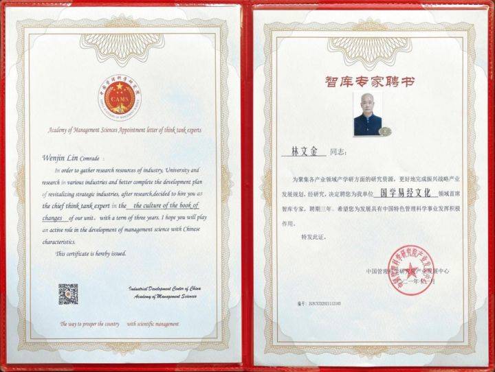 为深入贯彻党的十九大和五中全会重要精神,树立创新、协调、绿色、开放、共享的发展理念,聚集我国在各产业领域产学研方面的研究资源,推进国家治理体系和治理能力向高水平发展,建设中国管理科学研究院高端智库,更好地为产业经济发展服务,中国管理科学研究院产业发展中心决定组建“十四五”产业发展智库,同时在各产业领域中特聘一批具有代表性的专家、教授、学者及企业家作为中心智库专家成员,以共同建设和完善案例库、知识库等高端智库,进而为推动“十四五”各产业发展和管理科学事业发挥积极作用。鉴于当代著名风水堪舆专家林文金老师多年来在国学易经文化领域中名副其实为民造福的丰富实践案例、知名度、美誉度及行业影响力,2021年11月,经中管院研究决定:特聘著名风水堪舆专家林文金老师为中国管理科学研究院产业发展中心易经国学文化领域首席智库专家。