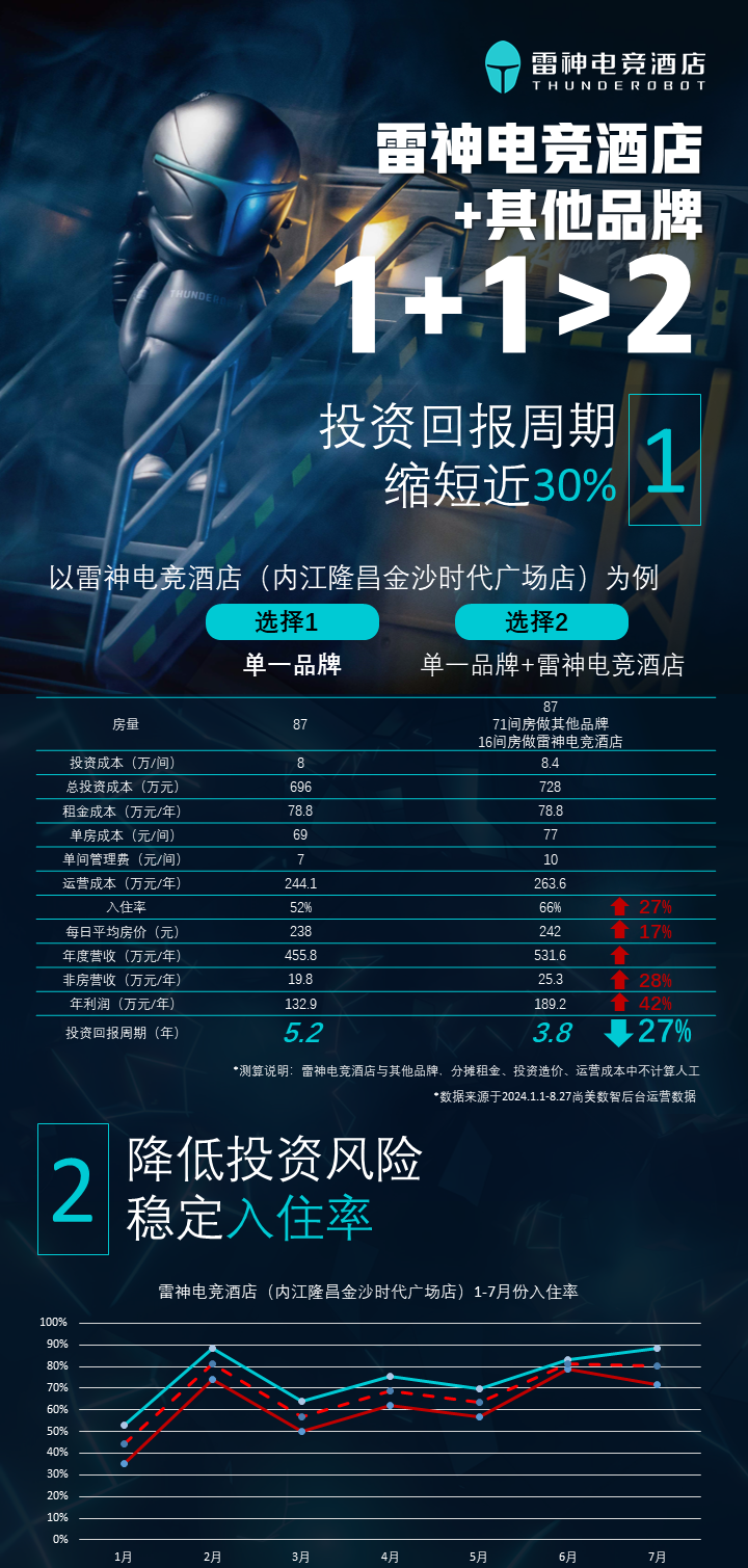 雷神电竞酒店提供从品牌授权、设计规划、设备采购到运营管理的一站式服务,帮助商务酒店快速转型并投入运营。凭借雷神电竞酒店的市场影响力和专业化支持,酒店可缩短投资回报周期,数据显示,整体投资回报周期有望缩短30%左右。